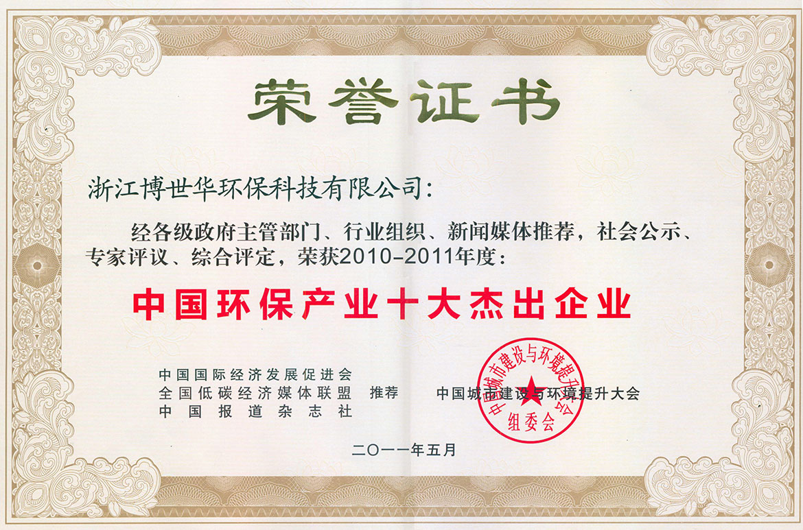 經各級政府主管部門、行業組織、新聞媒體推薦,社會公示、專家評議、綜合評定,公司榮獲2010-2011年度“中國環保產業十大杰出企業”