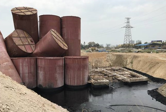 控制源頭。在事件現(xiàn)場設(shè)置了三道圍堰,確保儲罐區(qū)泄漏的硫酸控制在施工坑體內(nèi)。同時,確保2個大廢酸儲罐的絕對安全。事件發(fā)生時,2個大儲罐已有輕微傾斜。為防止小儲罐泄漏的硫酸浸泡腐蝕大儲罐,采取填土方式穩(wěn)固大儲罐,并實時監(jiān)測大儲罐是否下沉、傾斜、泄漏。